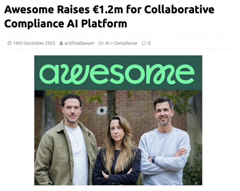De Nederlandse startup Awesome Compliance Technology (kortweg Awesome) heeft een pre-Seed investering van €1,2 miljoen opgehaald, geleid door het investeringsfonds Horizon Flevoland, met aanvullende steun van meerdere legal-tech angel-investeerders. Deze investeringsronde is bedoeld voor de verdere ontwikkeling en opschaling van een AI-platform dat speciaal is gebouwd voor compliance-professionals, met een eerste focus op Europese regelgeving zoals de AVG (GDPR), de EU AI Act en de Data Act.